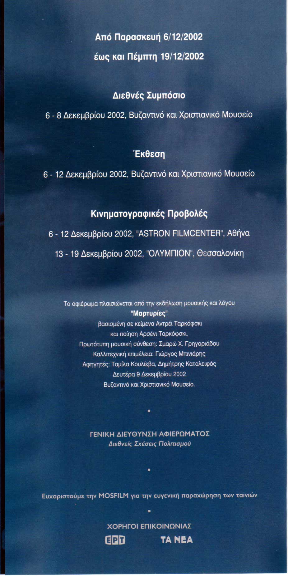 Tarkovsky 70th Anniversary Festival, Byzantine Museum of Athens, December 6 – 8, 2002